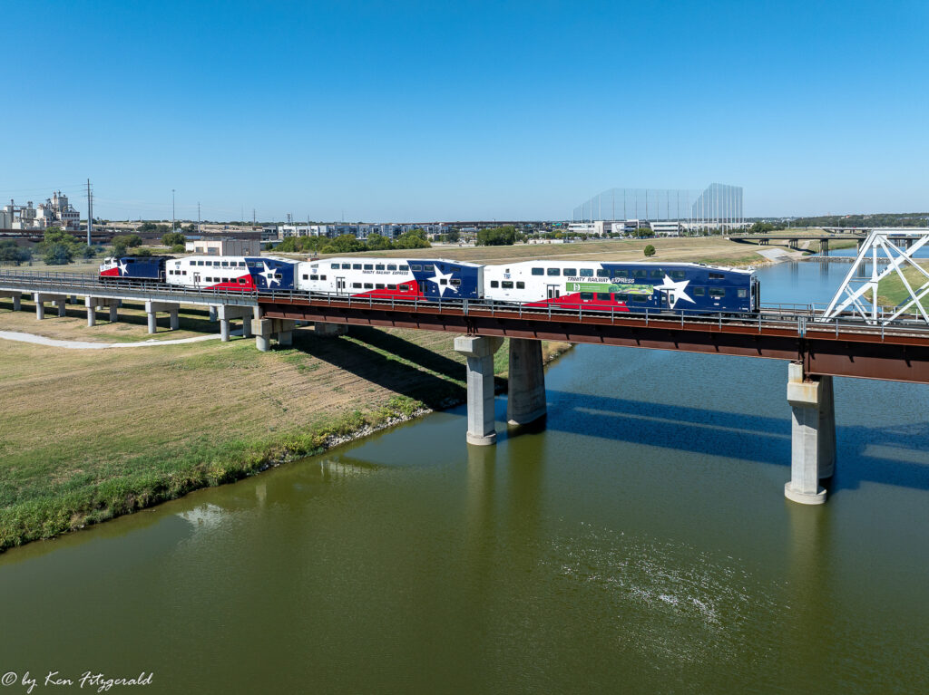 I set up on the east bank of the Trinity and launched the drone in time to catch a westbound TRE train over the river at 1:37 pm.