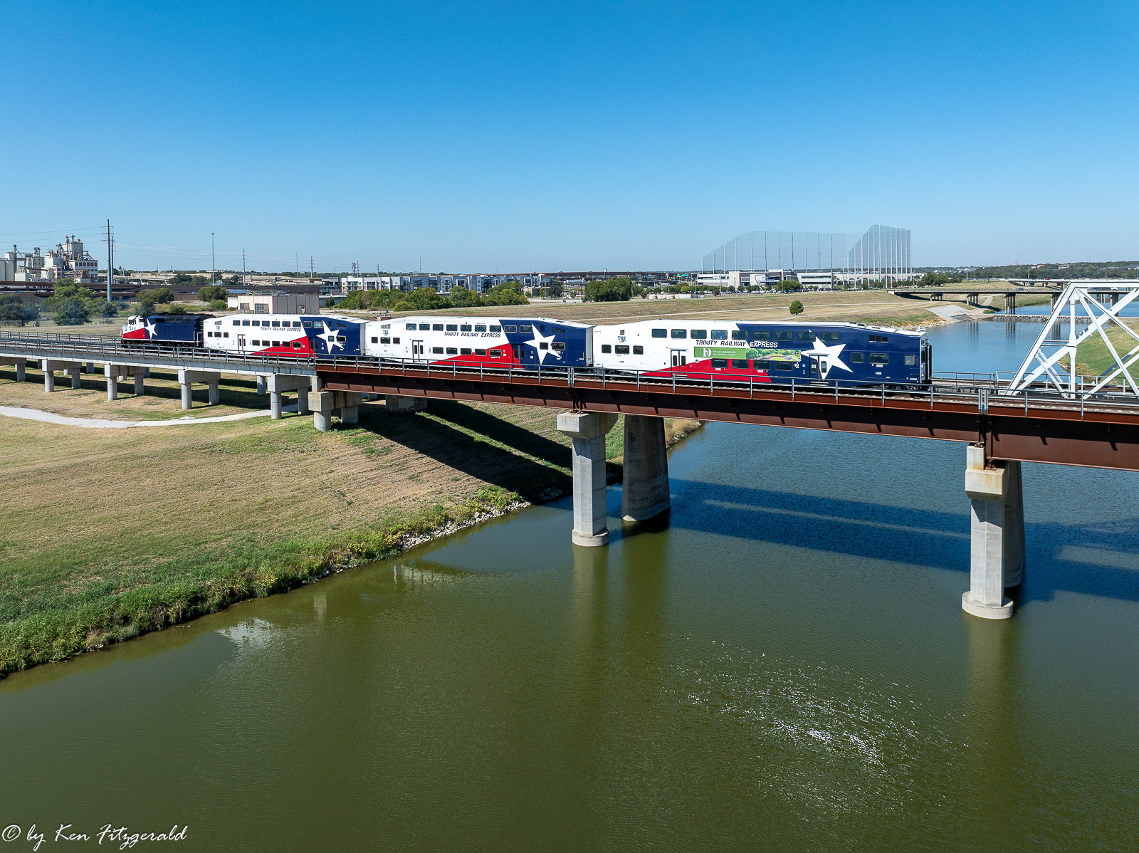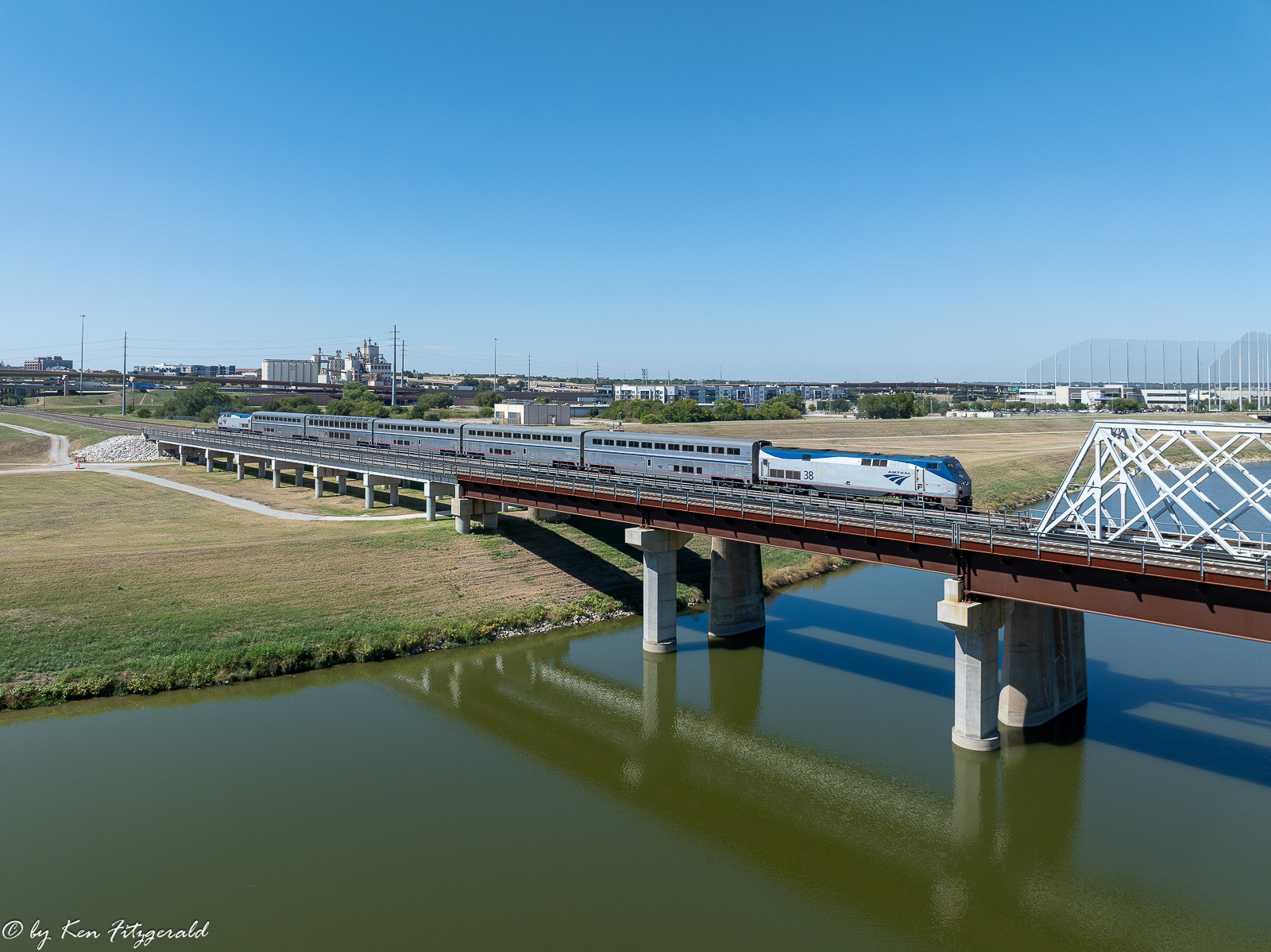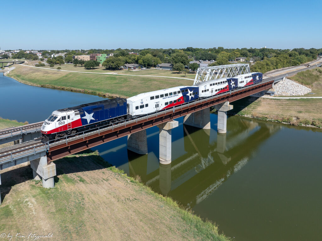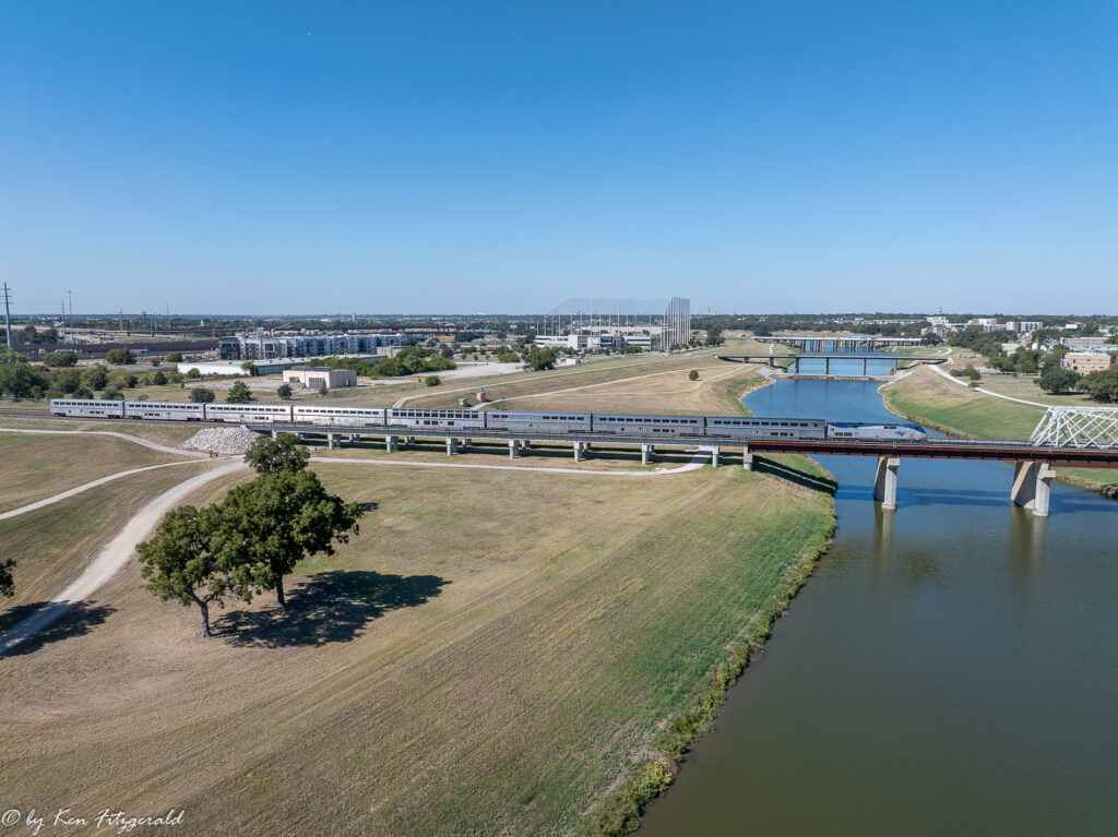 The Heartland Flyer was accelerating across the Trinity River but not so fast that I was able to reposition the drone for this view with more of the bridge in it.